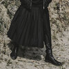 片側のみプリーツを施したアシンメトリーデザインのラップスカート。柔らかい風合いの生地に対して武骨なバックルが目を引くデザイン。様々なパンツの上から…